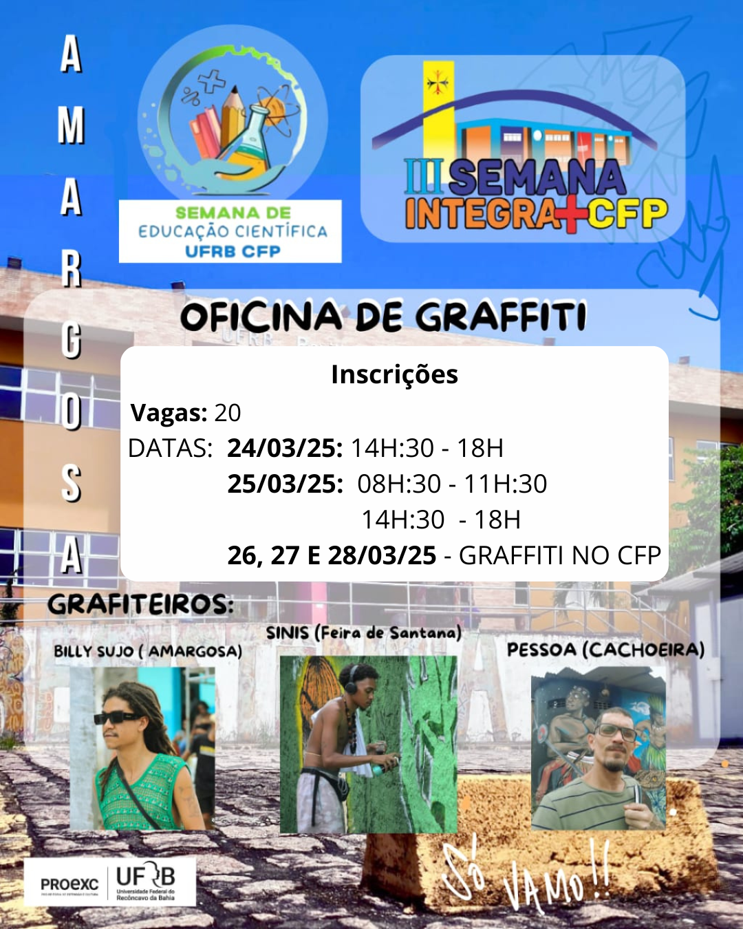 A organização do III Integra + CFP e da IV Semana de Educação Científica tem o prazer de promover, como programação especial, a Oficina de Graffiti, uma experiência única de arte e criatividade aberta a toda a comunidade acadêmica!