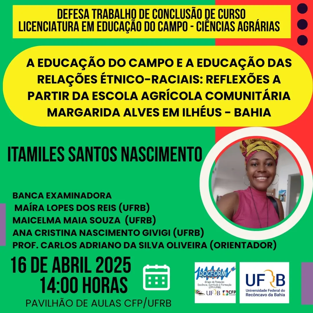 No próximo dia 16 de abril de 2025, às 14h, acontecerá a defesa do Trabalho de Conclusão de Curso (TCC) da estudante Itamiles Santos Nascimento, do curso de Licenciatura em Educação do Campo – Ciências Agrárias, pela Universidade Federal do Recôncavo da Bahia (UFRB).