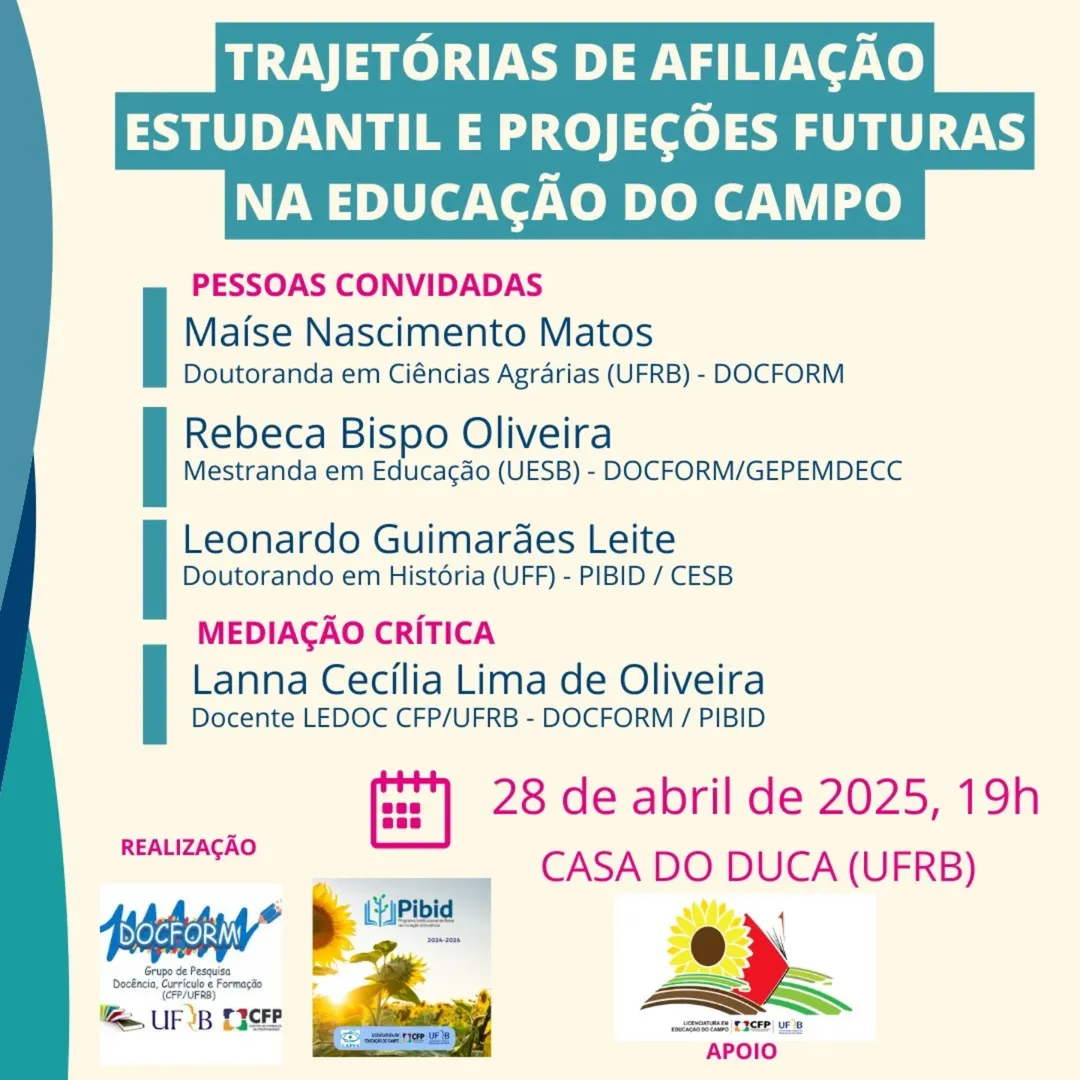O Grupo de Pesquisa Docência, Currículo e Formação (DOCFORM), em parceria com o PIBID e o Curso de Licenciatura em Educação do Campo (LEDO-CFP/UFRB), convida toda a comunidade acadêmica e interessados para o evento "Trajetórias de Afiliação Estudantil e Projeções Futuras na Educação do Campo".