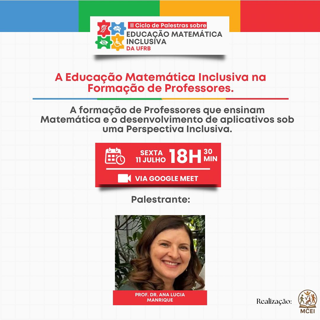 O 2º Ciclo de Palestras sobre Educação Matemática Inclusiva da Universidade Federal do Recôncavo da Bahia (UFRB) tem como tema "A Educação Matemática Inclusiva na Formação de Professores". O evento acontecerá de forma virtual, ao longo de três encontros distribuídos entre os dias 13 de junho e 11 de julho de 2025. Esta edição tem como proposta central ampliar os debates sobre a Educação Matemática Inclusiva, reconhecendo a carência dessa temática na formação inicial e continuada de professores que ensinam Matemática. O evento é uma iniciativa do Grupo de Extensão Materiais Curriculares Educativos Inclusivos (MCEI), que integra o Programa de Extensão Materiais Curriculares Educativos na Perspectiva Inclusiva: diálogos, construção e uso. A programação inclui apresentações de experiências formativas e práticas pedagógicas inclusivas desenvolvidas por licenciandos da UFRB, além de palestras com pesquisadoras convidadas que abordarão temas como a atuação de professoras com estudantes com deficiência visual e o desenvolvimento de recursos tecnológicos com foco na inclusão.
