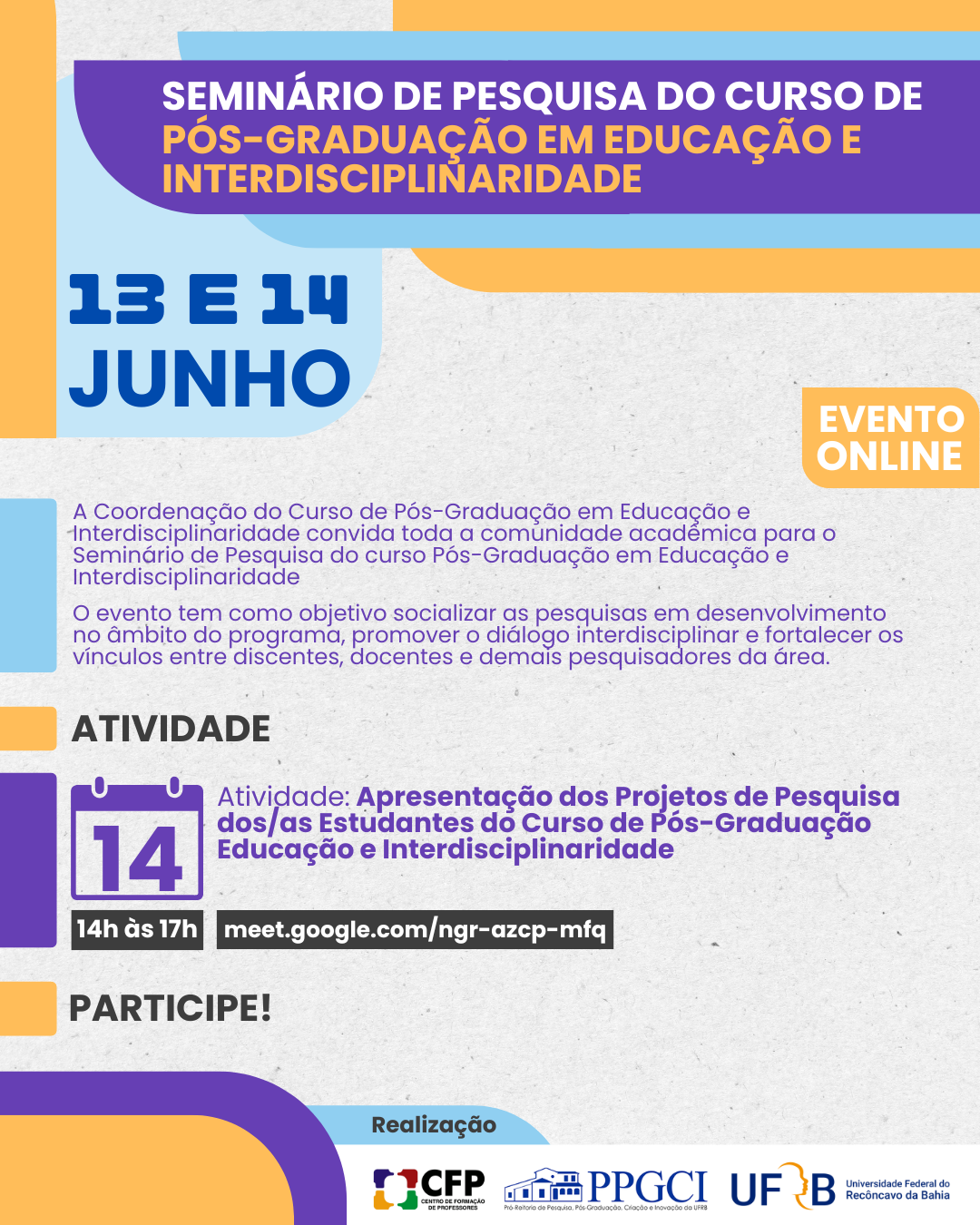 A Coordenação do Curso de Pós-Graduação em Educação e Interdisciplinaridade da Universidade Federal do Recôncavo da Bahia (UFRB) convida toda a comunidade acadêmica para participar do Seminário de Pesquisa do curso, que ocorrerá nos dias 13 e 14 de junho, de forma online.