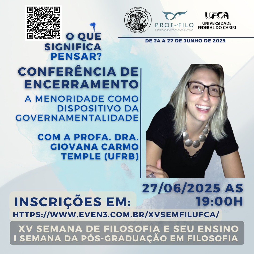 A Universidade Federal do Cariri (UFCA), por meio do Mestrado Profissional em Filosofia (PROF-FILO), convida toda a comunidade acadêmica e interessados(as) a participarem da Conferência de Encerramento da XV Semana de Filosofia e seu Ensino e da I Semana da Pós-Graduação em Filosofia.