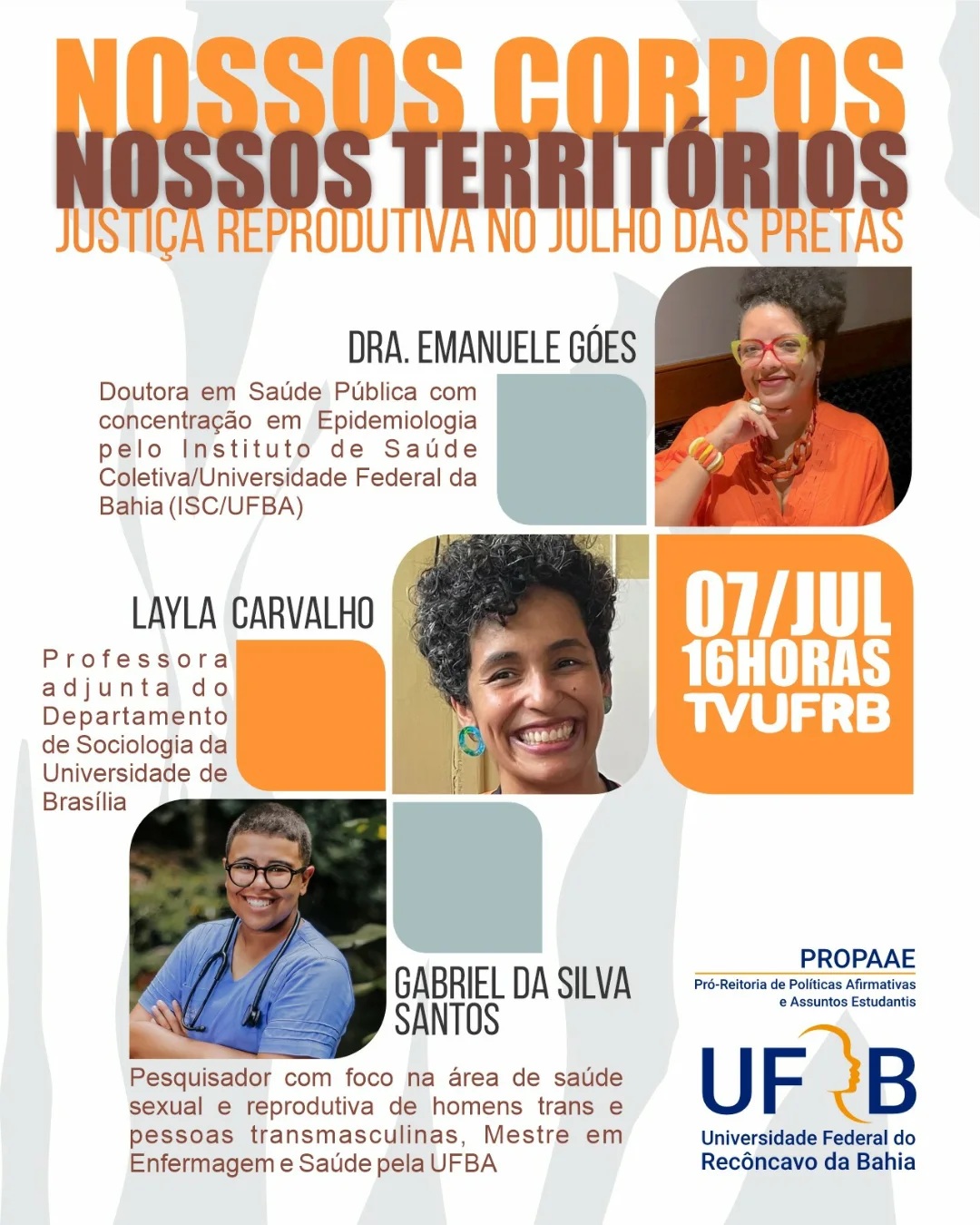 Convidamos você para um debate necessário sobre justiça reprodutiva como eixo central das lutas antirracista, feminista e interseccional. O evento é uma convocatória à reflexão crítica sobre os corpos negros como territórios de resistência e afirmação de direitos.