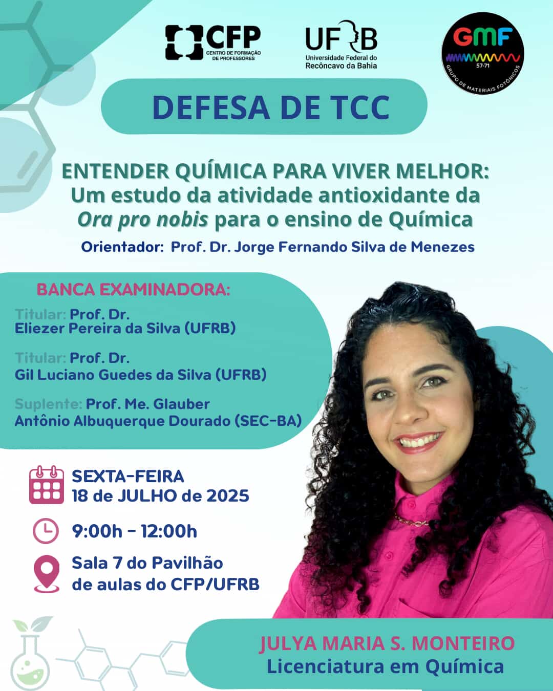 A estudante Julya Maria S. Monteiro, do curso de Licenciatura em Química do Centro de Formação de Professores da Universidade Federal do Recôncavo da Bahia (CFP/UFRB), realizará a defesa de seu Trabalho de Conclusão de Curso (TCC) no próximo dia 18 de julho de 2025, sexta-feira, das 9h às 12h. A apresentação acontecerá na Sala 7 do Pavilhão de Aulas do CFP/UFRB, localizado em Amargosa-BA.