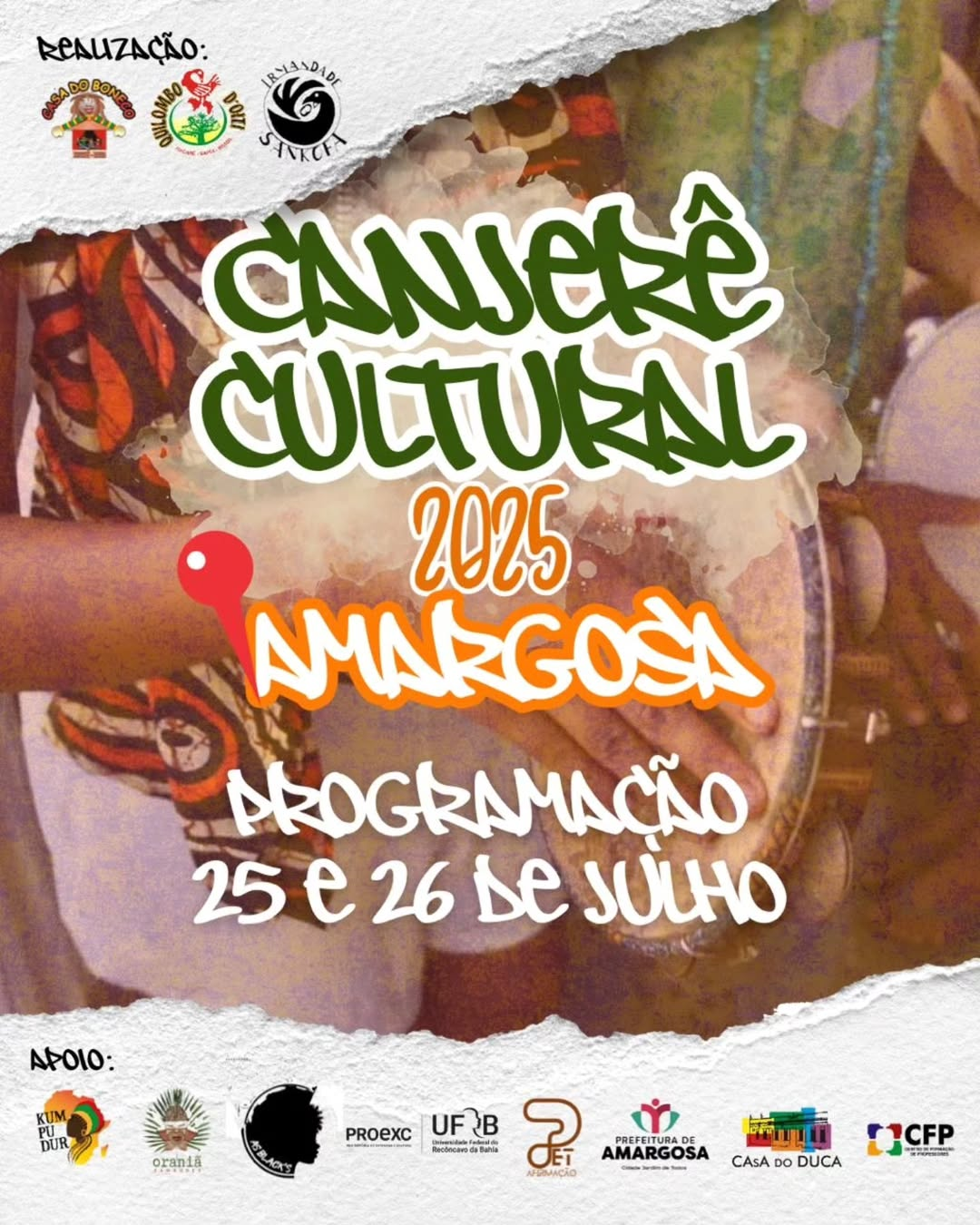 Nos próximos dias, 25 e 26 de Julho daremos continuidade ao circuito de atividades do Canjerê Cultural. Desta vez, as ações acontecerão em Amargosa, esta será a terceira cidade da edição 2025.A maior parte da programação acontecerá na @casadoduca Confira a programação completa em https://www.instagram.com/p/DMaODb0A-bI?img_index=2