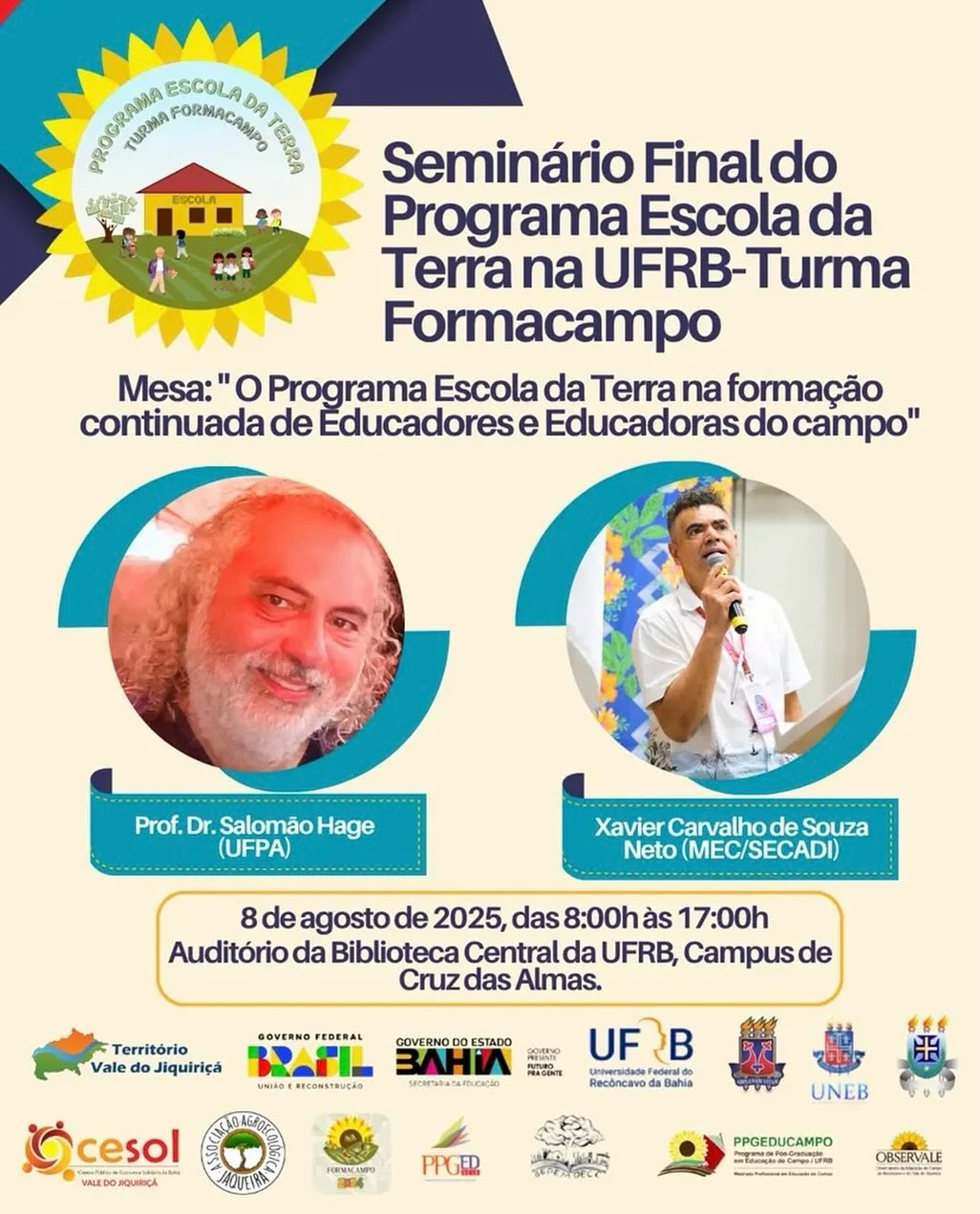 No dia 8 de agosto de 2025, será realizado o Seminário Final do Programa Escola da Terra na UFRB – Turma Formacampo, um momento de socialização e avaliação das ações formativas desenvolvidas ao longo do programa. O evento ocorrerá das 8h às 17h, no Auditório da Biblioteca Central da Universidade Federal do Recôncavo da Bahia (UFRB), Campus de Cruz das Almas.