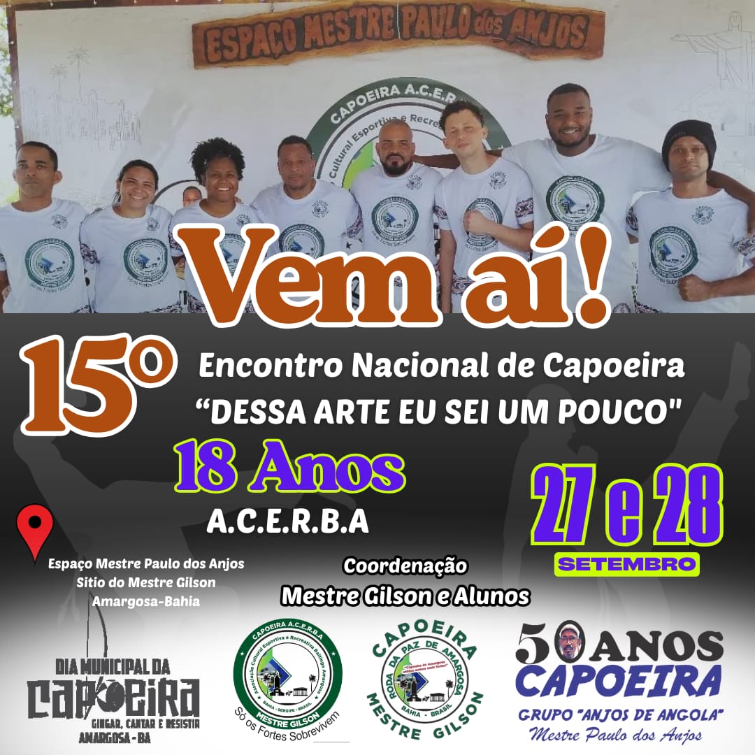 15 ° Encontro Nacional de Capoeira "Dessa Arte Eu sei um Pouco" é um evento que acontece anualmente, em que se reune varios capoeiristas, de variados lugares do pais, para a realiação de intercâmbio cultural, com a realização de oficinas, jogo, troca de saberes além de vivenciar muita capoeira. Este evento é realizado durante dois dias consecutivos sendo no sabado (27/09/2025) e no domingo (28/09/2025), sendo que no domingo é comemorado o Dia Municipal da Capoeira no municipio de Amargosa .