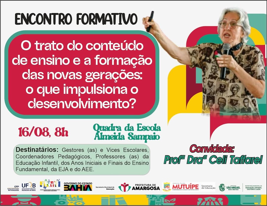 Educação que transforma! No dia 16 de agosto, às 8h, na Quadra da Escola Almeida Sampaio, será realizado um Encontro Formativo com a participação especial da Profª Draª Celi Taffarel. O tema central será “O trato do conteúdo de ensino e a formação das novas gerações: o que impulsiona o desenvolvimento?”, promovendo uma reflexão profunda sobre os caminhos que fortalecem o aprendizado e estimulam o crescimento educacional. O evento é voltado para gestores(as), vices escolares, coordenadores pedagógicos e professores(as) da Educação Infantil, dos anos iniciais e finais do Ensino Fundamental, da EJA e do AEE, configurando-se como uma oportunidade única de diálogo e formação para todos que acreditam no poder transformador da educação.