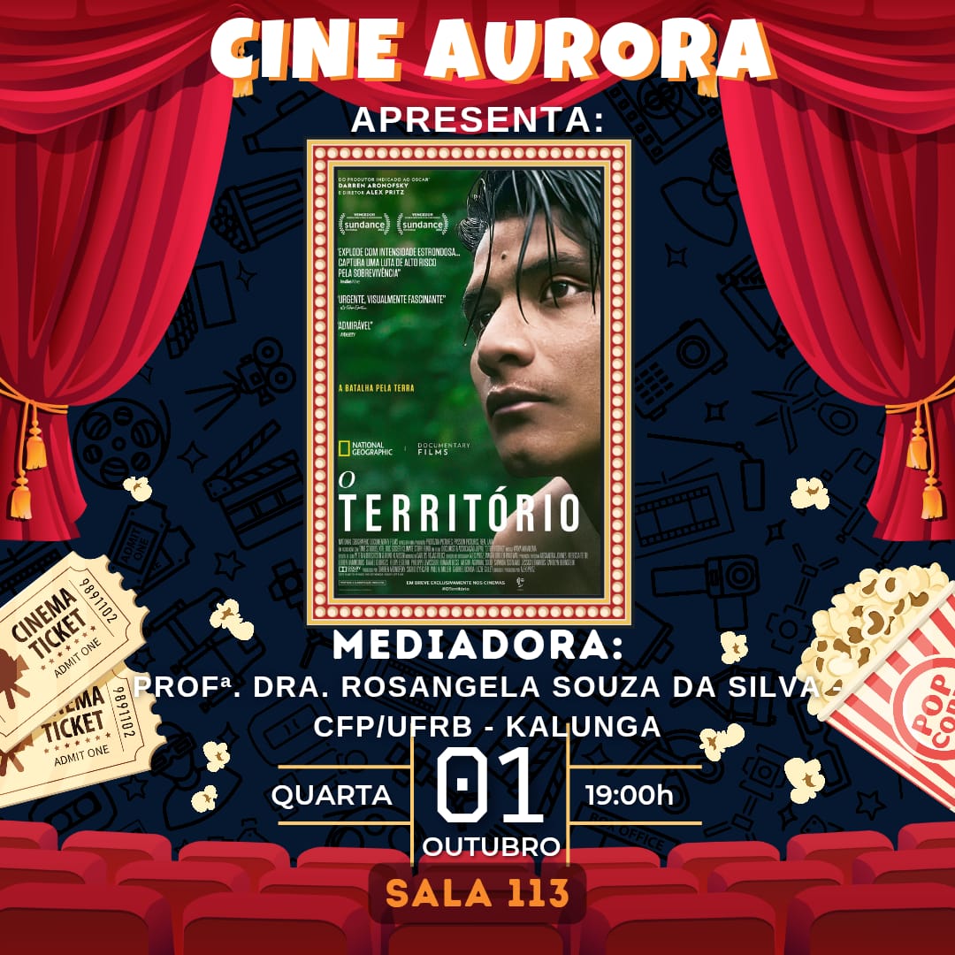 O Cine Aurora é coordenado pelas professoras Ana Carolina Reis (Filosofia UFRB/NUPEF), Yérsia Assis (Filosofia UFRB/NUPEF) e Lakshmi Vallim (Pedagogia/UFRB).O Cine Aurora realiza a exibição do documentário "O território", dirigido por Alex Pritz, com mediação da professora Doutora Rosangela Souza da Silva (Pedagogia/UFRB).Data: 01/10/2025Horário: 19hLocal: Sala do 113Evento com certificado