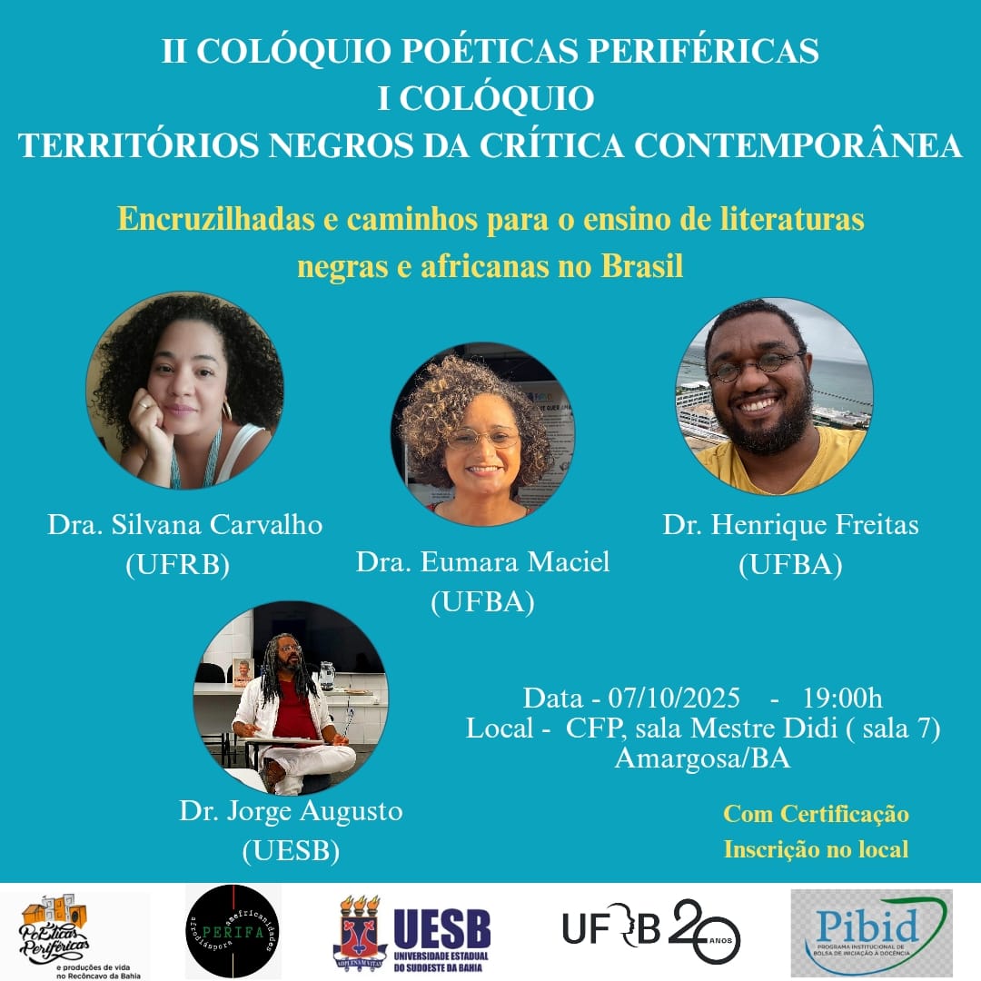 O II Colóquio PoÉticas Periféricas: Lei 10.639/2003, formação de professores e ensino de Literatura tem como objetivo dar continuidade à divulgação, discussão e fortalecimento das pesquisas voltadas para a formação de professores no âmbito da literatura e da cultura, tomando como referência o pensamento negro-brasileiro e africano. A atividade é desenvolvida em pareceria com o grupo de pesquisa PoÉticas Periféricas/CNPQ/UFRB) e I Colóquio Territórios Negros da Crítica Contemporânea: ensino de literaturas africanas e negro-brasileiras, organizado pelo grupo de pesquisa PERIFA/CNPQ/UESB.