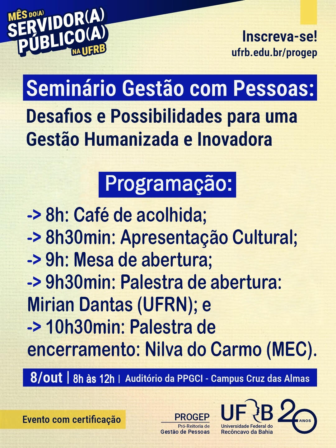 Na próxima quarta-feira, 08 de outubro, teremos o Seminário Gestão com Pessoas: Desafios e Possibilidades para uma Gestão Humanizada e Inovadora, promovido pela PROGEP como parte das ações e comemorações no Mês do(a) Servidor(a) Público(a).