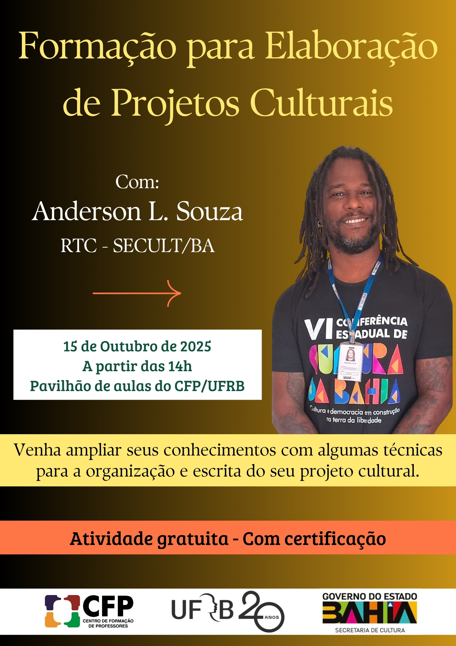 O Centro de Formação de Professores (CFP/UFRB) recebe Anderson L. Souza – Representante Territorial de Cultura (RTC/Secult-Ba) para realização de Formações para Elaboração de Projetos Culturais, no dia 15 de outubro de 2025, nos turnos da manhã (8h) e tarde (14h), no Pavilhão de aulas do CFP.