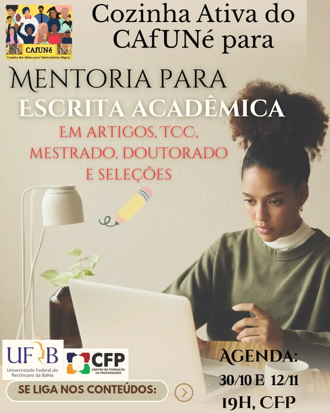 O projeto Cozinha Ativa do CAfUNé – Cozinha dos Afetos para Universitárias Negras promove a Mentoria para Escrita Acadêmica, uma iniciativa voltada ao fortalecimento da produção científica e acadêmica de estudantes da graduação e pós-graduação.
