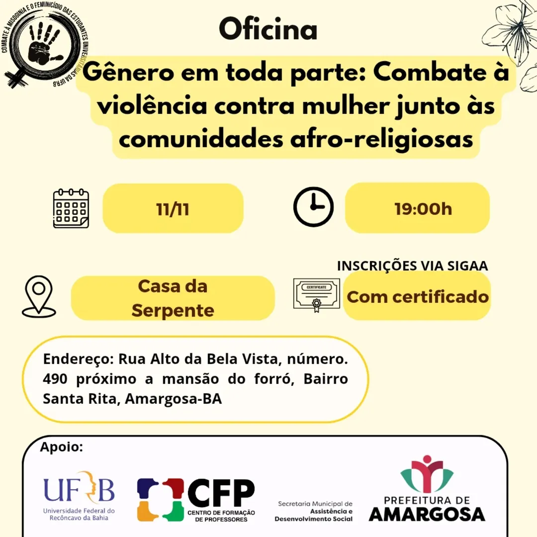Oficina vinculado ao projeto - Procfemi/PROPAAE/UFRB e Ministério das Mulheres. Nesse dia realizaremos uma oficina que discutirá as nuances e perspectivas sobre a violência de gênero, o machismo e o feminicídio que envolvem os cotidianos de muitas mulheres. Pensaremos coletivamente formas e meios de refrear as cenas de violências vividas e experimentadas, faremos isso através de um diálogo com a comunidafe afro-religiosa da Casa de Serpente, trazendo o ponto de vista ancestral das comunidades de terreiro como fonte de combate a violência de gênero.