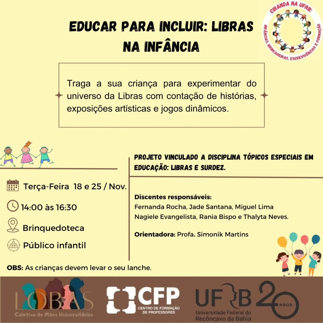 O projeto de extensão Ciranda na UFRB, em parceria com o projeto vinculado à disciplina Tópicos Especiais em Educação: Libras e Surdez, sob orientação da docente Simonik Martins, convida você e sua criança para experimentar o universo da Língua Brasileira de Sinais (Libras) com contação de histórias, exposições artísticas e jogos dinâmicos. Dias: 18 e 25 de Novembro (terças-feiras)14h às 16h30Brinquedoteca - CFP/UFRBPúblico: InfantilLembrete: as crianças devem levar o seu lanche!