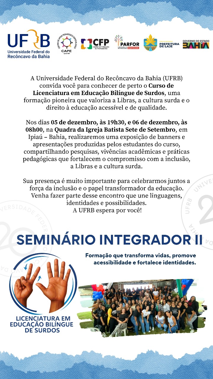 A Universidade Federal do Recôncavo da Bahia (UFRB) convida você para conhecer de perto o Curso de Licenciatura em Educação Bilíngue de Surdos, uma formação pioneira que valoriza a Libras, a cultura surda e o direito à educação acessível e de qualidade.