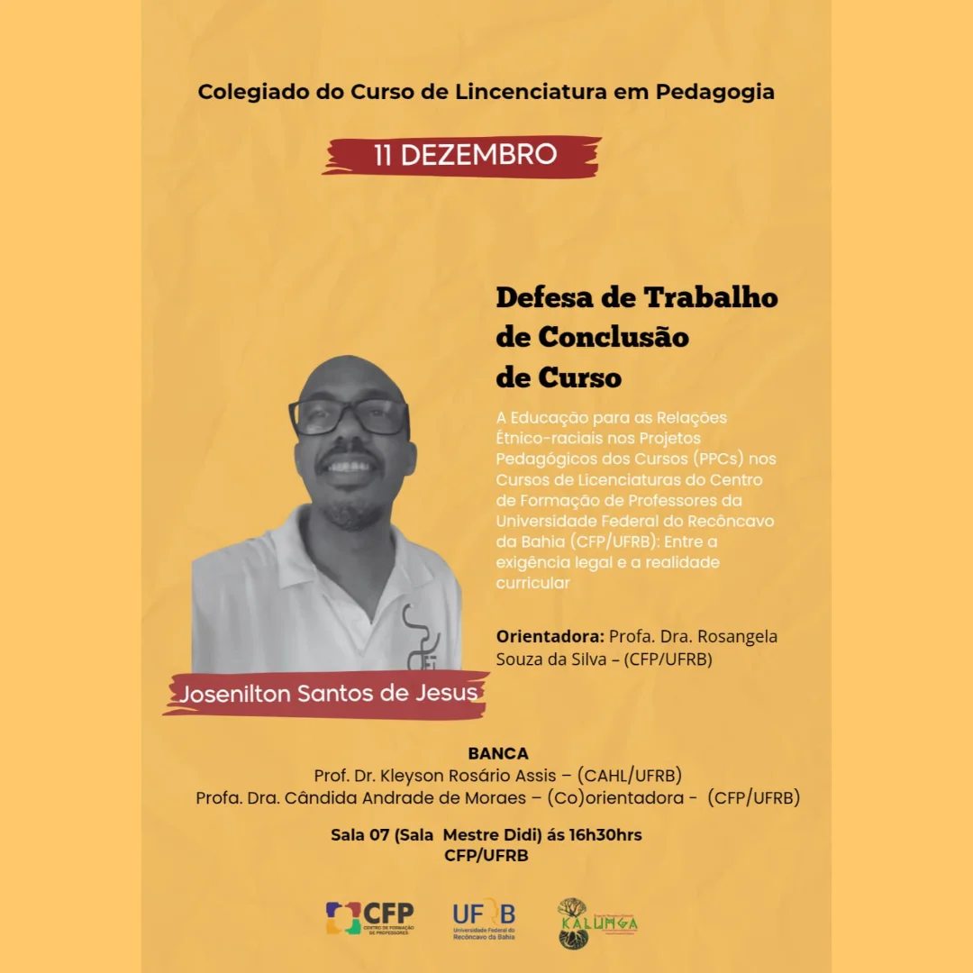 Temos a honra de convidar a comunidade acadêmica e externa para a sessão pública de defesa do Trabalho de Conclusão de Curso (TCC) do discente Josenilton Santos de Jesus.