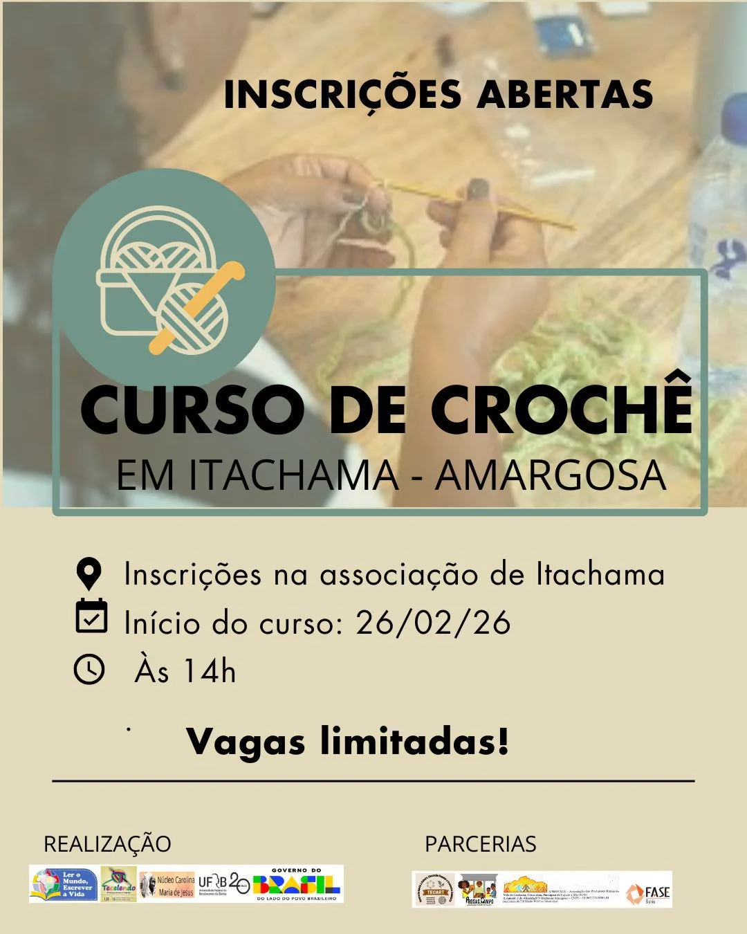A comunidade de Itachama, em Amargosa, comunica a abertura de inscrições para o Curso de Crochê. A iniciativa visa promover a capacitação artesanal e a integração dos moradores locais através de técnicas manuais.