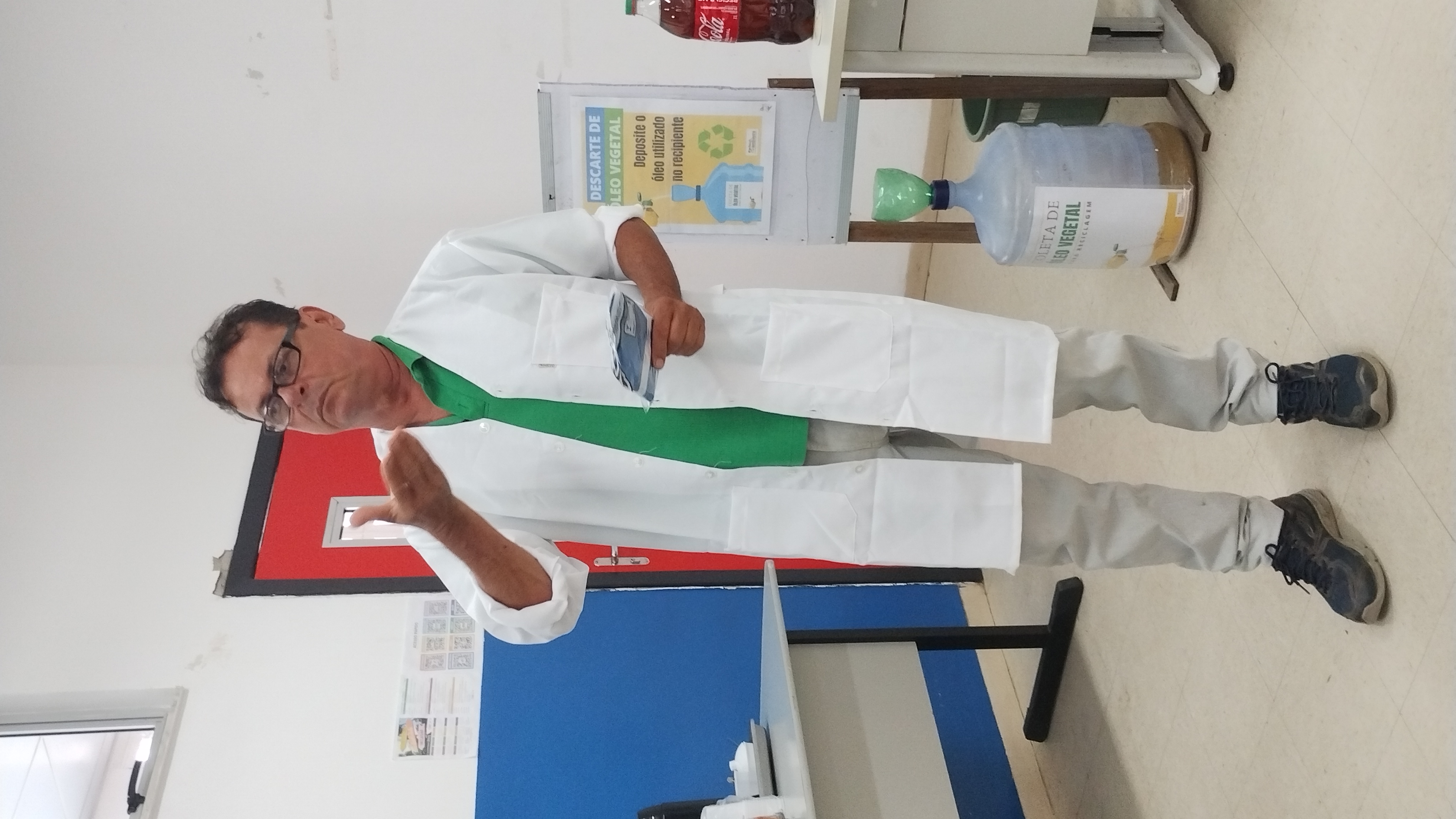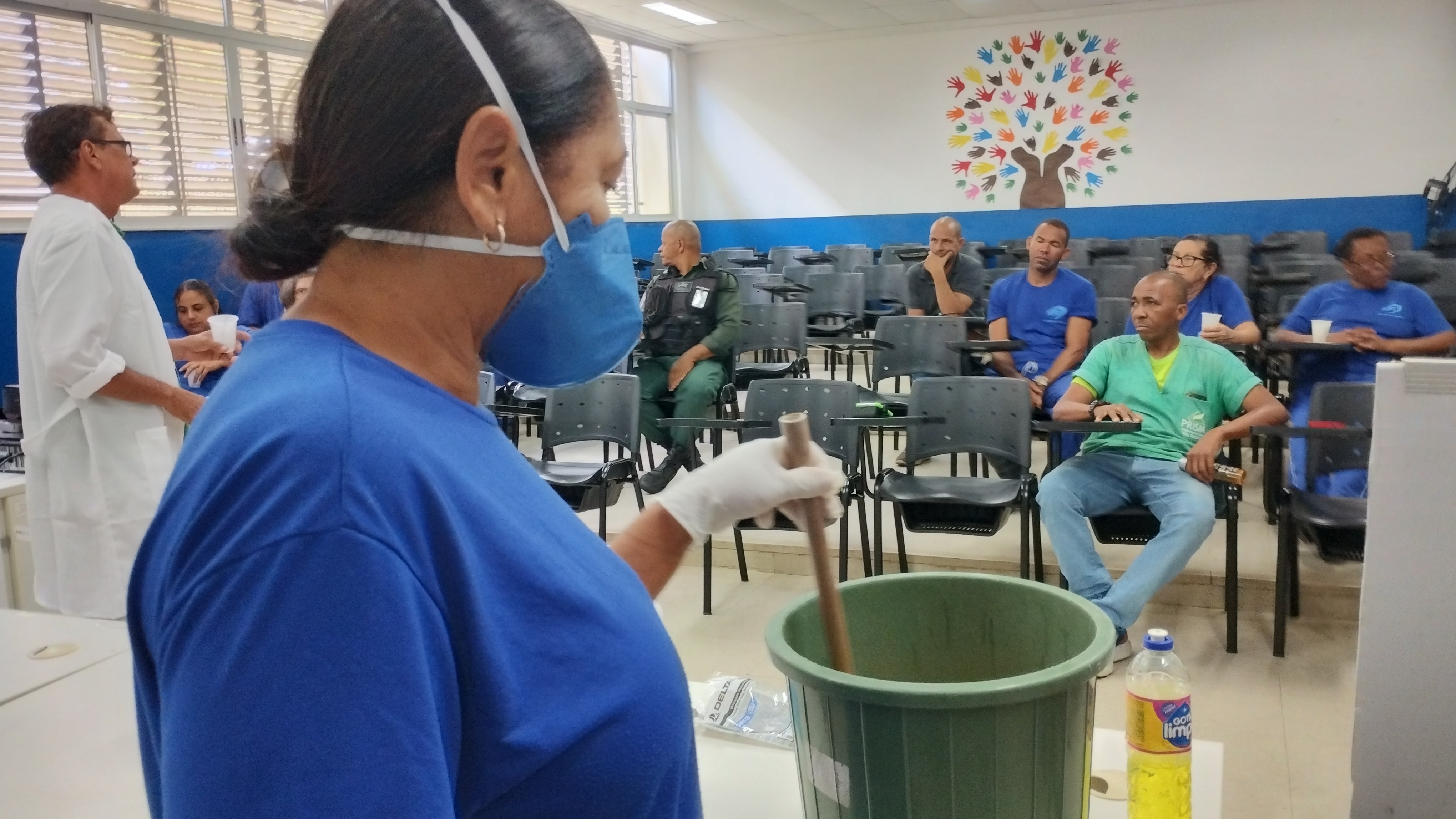 O instrutor apresentou os ingredientes básicos para a produção do sabão caseiro (água, óleo e soda cáustica), reforçando que existem diversas formas de prepará-lo, cabendo a cada pessoa escolher a mais adequada. Ele também alertou sobre os cuidados necessários no manuseio da soda cáustica (96-99%), como o uso obrigatório de máscara e luvas protetoras, e detalhou o processo de mistura.