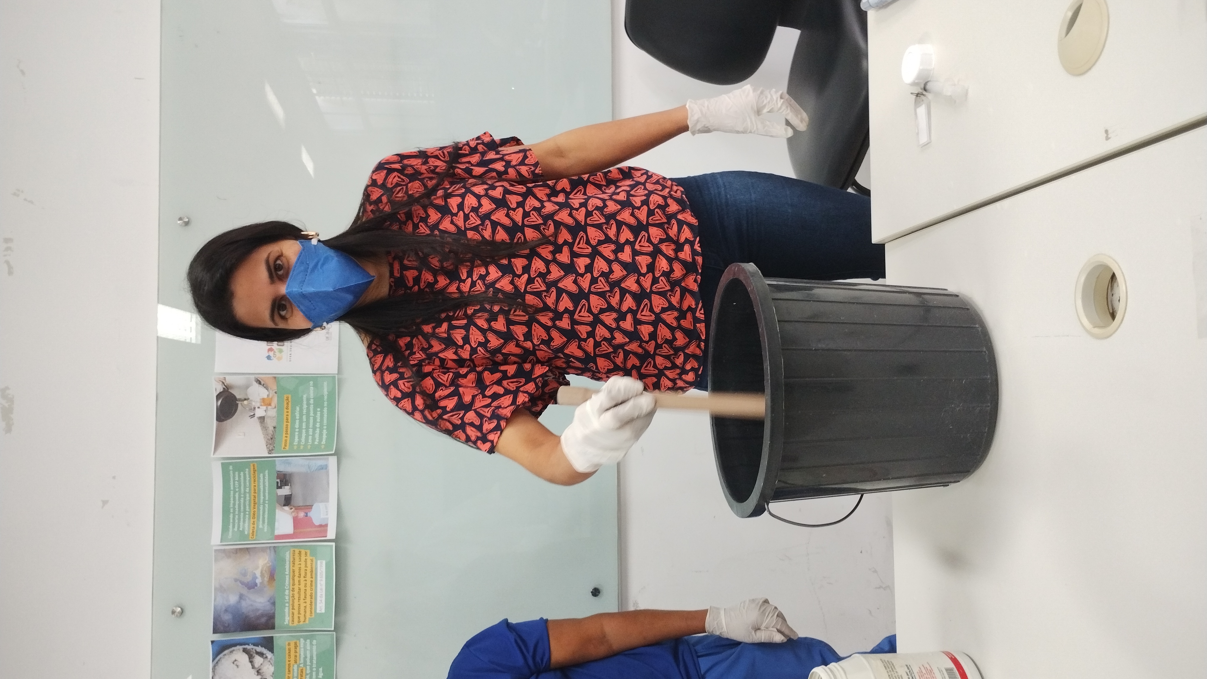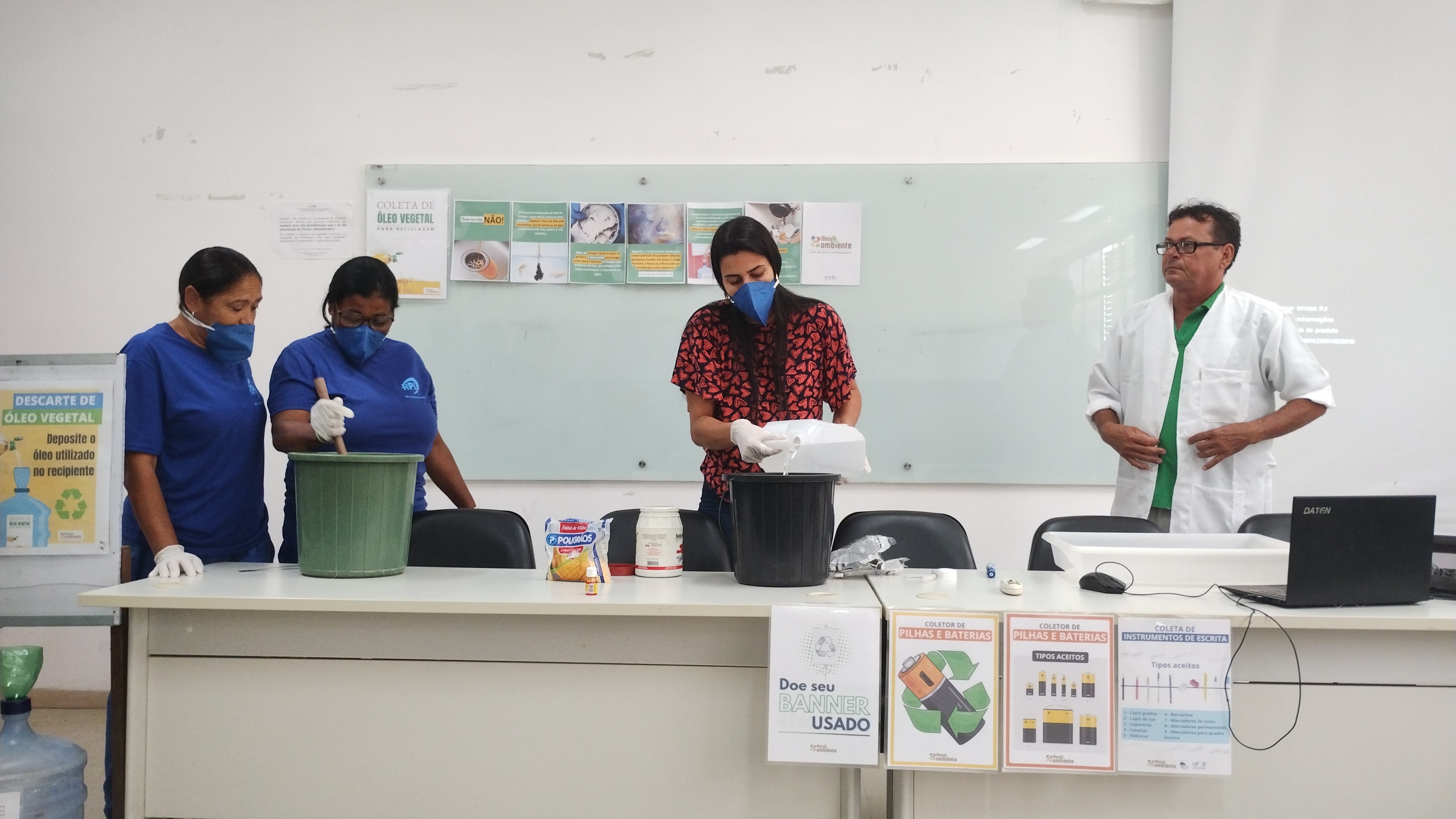 Após a explicação teórica e a exibição de um vídeo demonstrativo, três voluntárias participaram da parte prática, realizando a mistura e o preparo conforme as orientações recebidas. Ao final, a mistura foi deixada para repousar, e devido ao tempo de secagem, o resultado final será divulgado posteriormente nas redes sociais do CFP. O sabão produzido será distribuído entre os participantes da oficina, e o excedente ficará disponível para a comunidade acadêmica na portaria do Pavilhão Administrativo.
