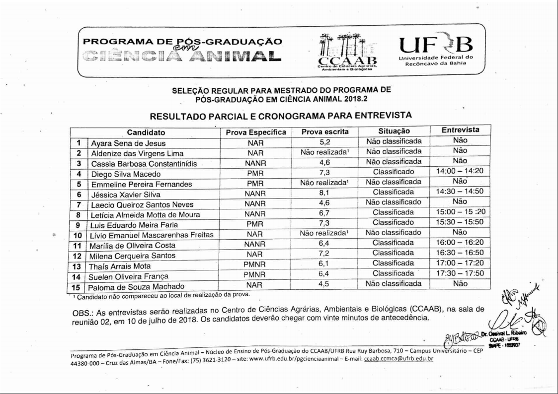 Em virtude da paralisação dos Técnicos Administrativos em Educação, durante os dias 19 e 20 de junho de 2018 (terça e quarta feira), as inscrições presenciais serão recebidas pelo Vice-Coordenador do Curso de Mestrado em Ciência Animal, Prof. Ossival Ribeiro, na Sala da Coordenação do Curso, Prédio de Solos.