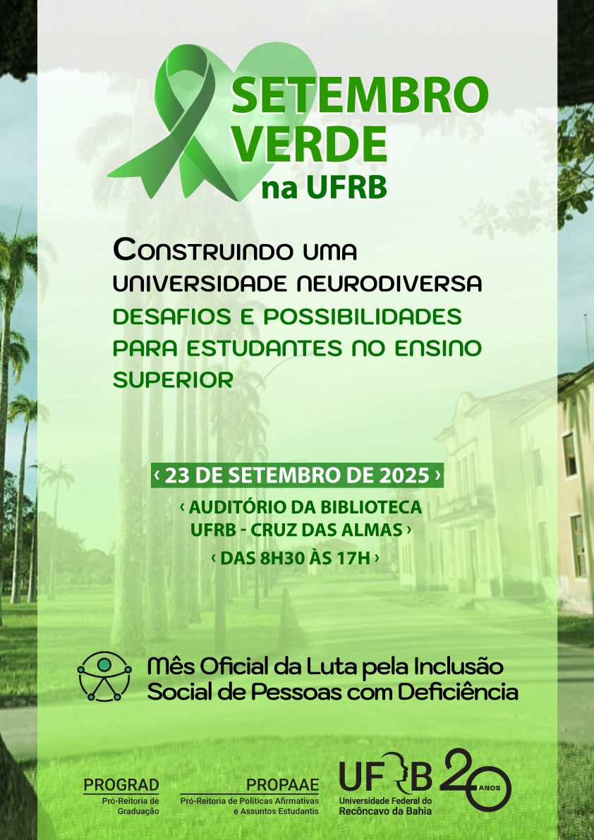 A UFRB, através da Pró-reitoria de Graduação, promove o evento "Setembro Verde na UFRB" Em comemoração ao setembro verde, mês dedicado à Pessoa com Deficiência e conscientização sobre a importância da inclusão.